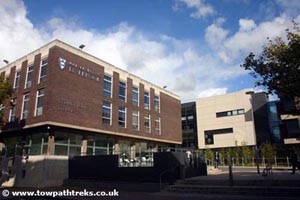 Cross the road and walk straight ahead. On your left is the university sports hall with its swimming pool and sports facilities. On the right is the school of architecture. The large windows allowing plenty of light inside for the students working on their designs and drawings.
