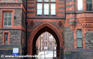 Cross the university square which has been refurbised and now has wireless internet for students. Head over to the large red brick Victoria Building with its clock tower. The Victoria Building is the landmark building of the university. It is said to be the origin of the phrase "red brick university". Walk down Brownlow Hill with the Victoria Building on your right. Look out for the huge wooden doors, the original university letter box and the dedication stone of the university college. The plan once was to have university buildings along both sides of Brownlow Hill heading down into the city centre. Instead the university expanded out either side of the road rather than along it.