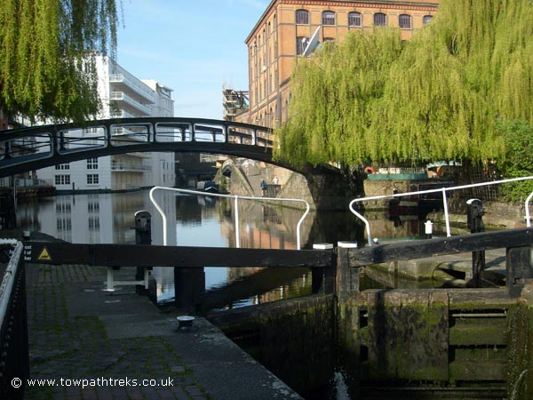 A metal bridge takes the towpath from one side of the locks to the other avoiding an arm of the canal which once led to timber warehouses.