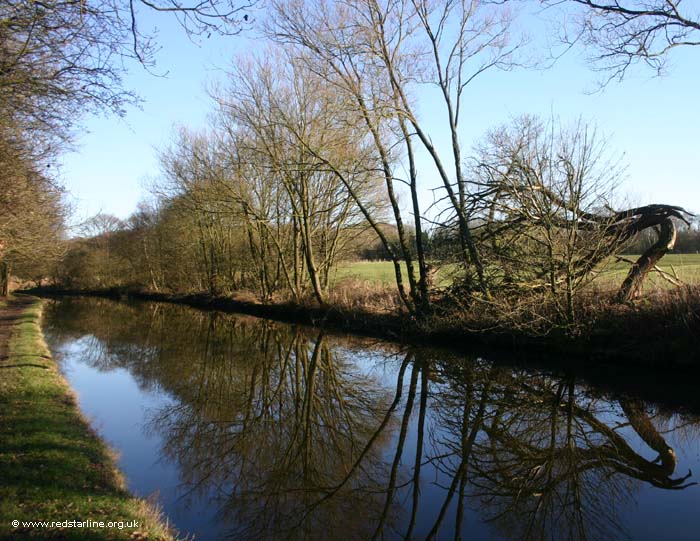 A broken tree is reflected in the still water of the canal. There is an overgrown arm off the canal near here.