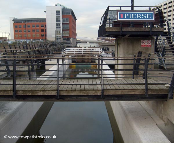 Looking along the lock, north. The canal passes underneath and enters the tunnel.